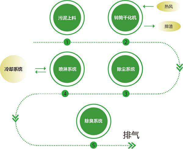 污泥干化系統,廢水“零排放”工藝,污泥通過轉筒干化機直接干化,熱效率可以達到80%以上,整個干化過程不產生廢水排放,適用于有廢水“零排放”要求的業主。