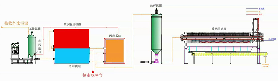 用連續(xù)加壓加溫的方法,添加少量催化劑,加速污泥中的有機(jī)物分解,使污泥中的“結(jié)合水”、“間隙水”轉(zhuǎn)化為“自由水” ,并通過機(jī)械壓濾的方式,達(dá)到含水率<30%效果。